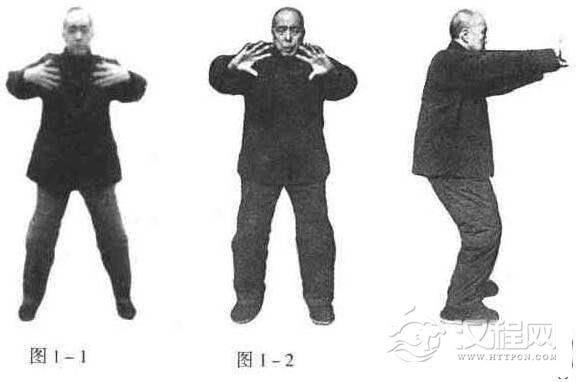 两脚平行开立,与肩同宽;两臂自然下垂,两手置于大腿外侧,手心朝里;两膝微屈,膝盖与脚尖在同一垂直线上;上身正直,胸背肌肉要放松,松腰,垂臀,顶头,竖项。然后两臂向前徐徐抬起,高与肩平,屈肘沉肩,如在胸前抱球状,掌心朝里,两中指尖相距约1分米(3寸许)(图1-1)