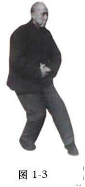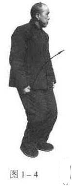 两膝向里合劲,两足尖向里扣劲,两脚跟向外拧劲,上下左右,一齐将劲合住,舌抵上颚,用鼻徐徐呼吸.勿使有声。吸气咽下时,眼要向上翻,以泄阴火,使真气归于丹田,站到困极之时,可将两脚调换一下,一切姿势,仍如前述。如此轮换着站,每天早晚两次,每次站40分钟以上,多站不限。此式乃是形意拳练底盘最有效的功夫,简单易学,长功夫快,练之久则脚步稳健,且莫等闲视之(图1-3)。
