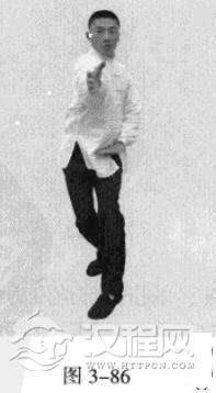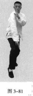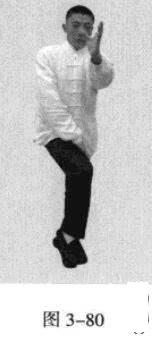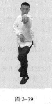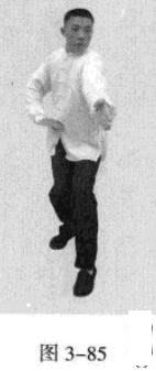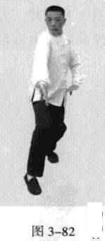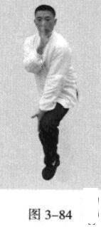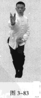 动作不停,以头领身,身带步,左脚急过右脚向前踩出一步,内扣15度,右脚随追半步,成立身中正之势,以保持重心的稳固;同时,左手并拢成插掌,以指尖部位发力向前插击,在左手插掌发力的同时,右手从前下方向上划一立圆收回右侧腰际。(图3-83-图3-85)