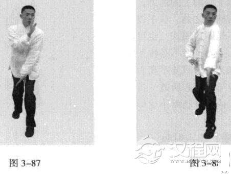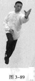 承上式。腰向左旋转,带动右手臂由下向前上方划一立圆(图3-86)。紧接着,腰向右旋转,以头领身,身带步,左脚向前踩出一步脚尖着地,内扣15度;同时,右手从前上方向回经面部,又往下划一立圆拉回右侧腰际,左手以掌外缘发力向前撩击,拇指朝下,掌心向左(图3-87、图3-88)。
