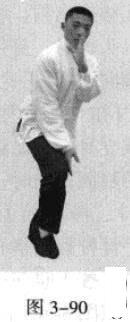 动作不停,以头领身,身带步,右脚过左脚急向前踩出一步,内扣15度,左脚随追半步,成立身中正之势.以保持重心的稳固;同时,右手并拢成插掌,以指尖部位发力向前插击,在右手插掌发力的同时,左手从前下方向上划一立圆收回左侧腰际。(图3-89一图3-91)