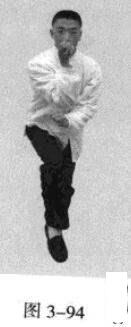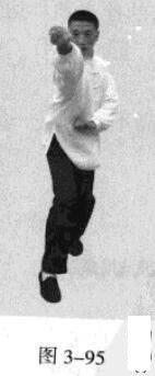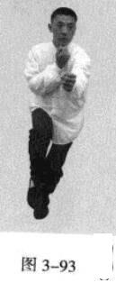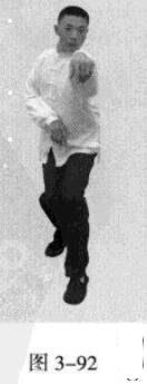 起势熊出洞。移动重心向前,以头领身,身带步,右脚过左脚向前踩出一步,脚尖着地,内扣15度,左脚随追半步,成立身中正之势,以保持重心的稳固;同时,右拳从腹前经口、鼻向前上方钻裹而出,手臂拧翻,拳心朝上,左拳回拉下按于腹部;目视拳之所指。(图3-92-图3-95)