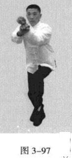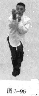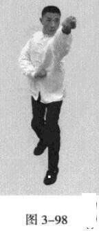 承上式。移动重心向前,以头领身,身带步,左脚过右脚向前踩出一步,脚尖着地,内扣15度,右脚随追半步,成立身中正之势,以保持重心的稳固;同时,左拳从腹前经口、鼻向前上方钻裹而出,手臂拧翻,拳心朝上,右拳回拉下按于腹部;目视拳之所指。(图3-96一图3-98)