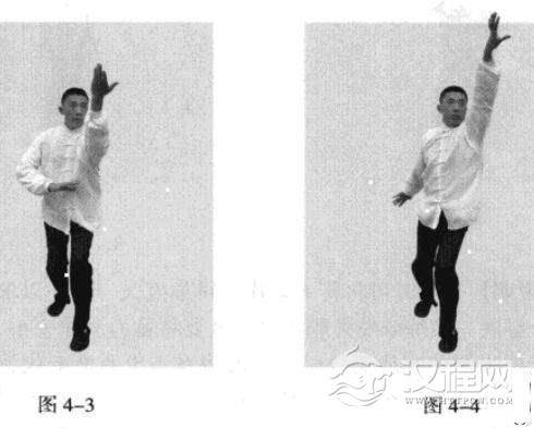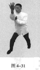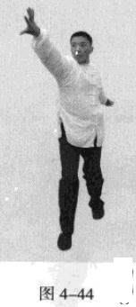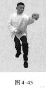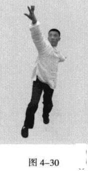 紧接着,右脚过左脚向右前方45度角踩进一步,脚尖着地,内扣15度,左脚随追半步.成立身中正之势,以保持重心的稳固;同时,右手臂向45度角前上方逆时针螺旋拧出,左手臂同时做顺时针螺旋拧转向后鞭开,与右手形成对争之力并呼气。(图4-30)