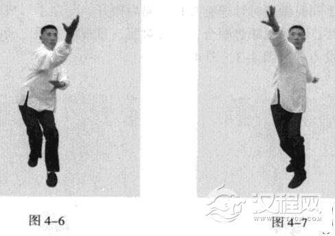 接着,以头猛然将身体领起,腰部随之向左旋转;同时脚下蹬地,催动右手臂向前上方,逆时针螺旋拧出,左手臂同时做顺时针螺旋拧转向后鞭开,与右手形成对争之力并呼气;身体成拗势逆合,三尖对照,目视前方手之所指。此为后手发力。(图4-6、图4-7)
