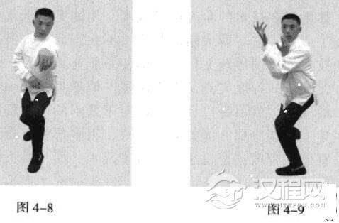 起势熊出洞。左脚向内侧扣脚,身体下沉蹲坐并吸气;双手臂在胸前拧转成手心朝上,全身蓄力(图4-8、图4-9)。