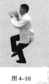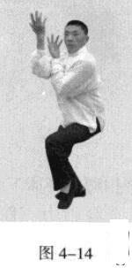 起势熊出洞。身体下沉蹲坐并吸气,重心在右脚;同时,双手臂在胸前拧转成手心朝上,全身蓄力,如待发之箭(图4-17,图4-18)。