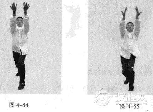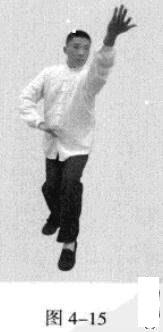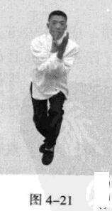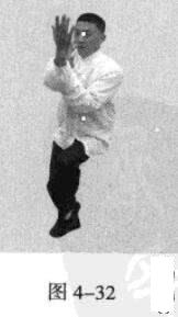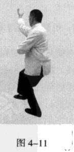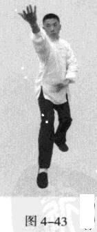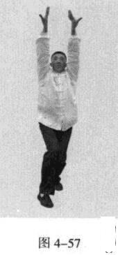 接着,移动重心向前,以头领身,身带步,右脚过左脚向前踩出一步,脚尖着地.内扣15度,左脚随追半步,成立身中正之势,以保持重心的稳固;同时,双手臂向前上方螺旋拧出,左手顺时针拧翻成拇指朝下,手心朝左,右手逆时针拧翻成拇指朝下,手心朝右;随之呼气。此为过步发力。(图4-57)
