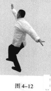 接着,身体向右后转体180度,以头领身,身带步,右脚向前踩出一步,左脚随追半步,以保持重心的稳固;同时,右臂向前上方逆时针螺旋拧出,左手同时做顺时针螺旋拧转向后鞭开,与右手形成对争之力并呼气;身体成顺势顺合,三尖对照,目视前方手之所指。此为右式。(图4-10一图4-12)