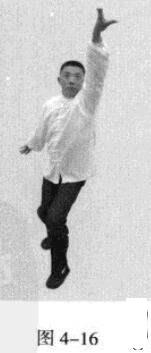 身体向左转体180度,以头领身,身带步,左脚向前踩出一步,右脚随追半步,以保持重心的稳固;同时,左手臂向前上方顺时针螺旋拧出,右手做逆时针螺旋拧转向后鞭开,与左手形成对争之力并呼气;身体成顺势顺合,三尖对照,目视前方手之所指。此为左式。(图4-14-图4-16)