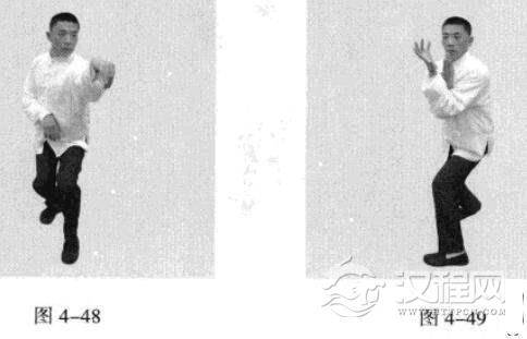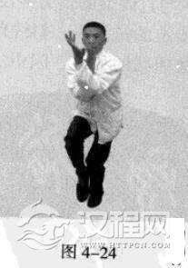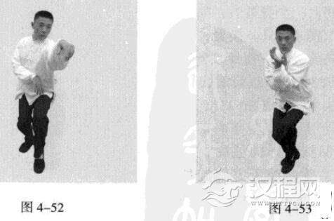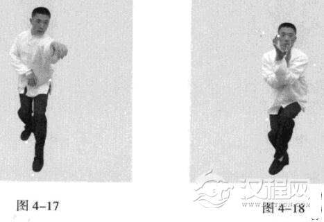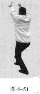 接着,身休向右后转体180度,以头领身,身带步,使右脚向前踩出一步,左脚随追半步,以保持重心的稳固;同时,催动双手臂向前上方螺旋拧出,左手顺时针拧翻成拇指朝下.手心朝左,右手逆时针拧翻成拇指朝下,手心朝右;随之呼气。(图4-50、图4-51)