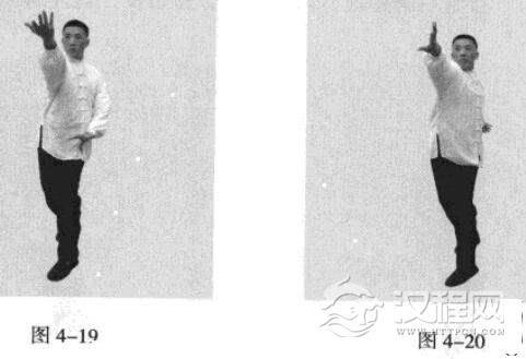 接着右脚蹬地,以头领身,身带步,催左脚向前踩出一步,脚尖着地,内扣15度,右脚随迫半步,成立身中正之势,以保持重心的稳固;同时,腰部向左旋转,右手臂向前上方逆时针螺旋拧出,左手臂同时做顺时针螺旋拧转向后鞭开,与右手形成对争之力并呼气;身体成拗势逆合。此为寸步后手发力。(图4-19、图4-20)