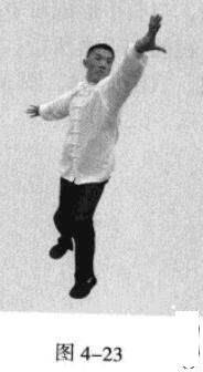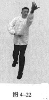 接着,右脚蹬地,以头领身,身带步,催左脚向前踩出一步,右脚随追半步,以保持重心的稳固,同时腰部向右旋转;左手臂向前上方顺时针螺旋拧出。右手同时做逆时针螺旋拧转向后鞭开,与左手形成对争之力并呼气;身体劝劫匾势顺合,三尖对照,目视左手之所指。此为寸步前手发力。(图4-22,图4-23)