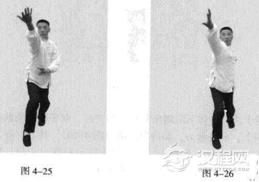 接着,移动重心向前,以头领身,身带步,右脚过左脚向前踩出一步,脚尖着地,内扣15度,左脚随追半步,成立身中正之势,以保持重心的稳固;同时,右手臂向前上方逆时针螺旋拧出,左手臂同时做顺时针螺旋拧转向后鞭开,与右手形成对争之力并呼气;身体成顺势顺合,三尖对照,目视前方手之所指。此为过步发力右式。左势与之要领一致,故略。(图4-25、图4-26)