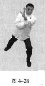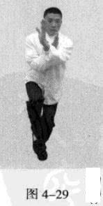 起势熊出洞。移动重心向前,以头领身,身带步,左脚向左前方45度角踩进一步,脚尖着地,右脚悬脚虚提于左脚内侧;同时,双手臂拧转成手心朝上,全身蓄力,如待发之箭,并吸气(图4-27-图4-29)。