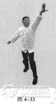 紧接着,左脚过右脚向左前方45度角踩进一步,脚尖着地。内扣15度,右脚随追半步,成立身中正之势,以保持重心的稳固;同时,左手臂向45度角前上方顺时针螺旋拧出,右手臂同时做逆时针螺旋拧转向后鞭开,与左手形成对争之力并呼气。如此循环练习即可。(图4-33)