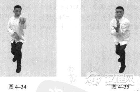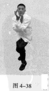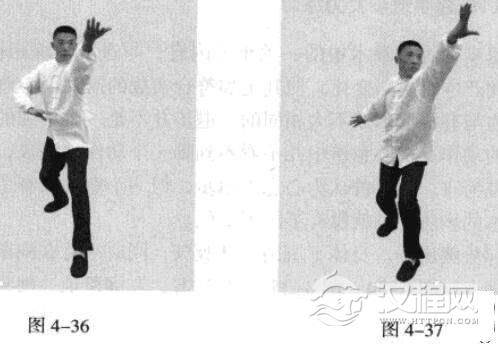 紧接着,左脚蹬地,使身体向后移动爪心,右脚向后撤步,落地时五趾抓地,左脚在前,随即脚尖着地下踩;左手臂向前上方顺时针螺旋拧出,右手臂同时做逆时针螺旋拧转向后鞭开,与左手形成对争之力并呼气。此为退后脚、前手发力。(图4-36、图4-37)