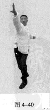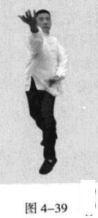 紧接着,左脚蹬地,使身体向后移动重心,右脚随即向后撤步,落地时五趾抓地,左脚在前,随即脚尖着地下踩;右手臂向前上方逆时针螺旋拧出,左手臂同时做顺时针螺旋拧转向后鞭开,与右手形成对争之力并呼气。此为退后脚、后手发力(图4-39、图4-40)。
