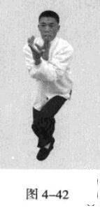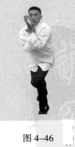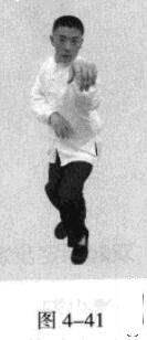 退步后手发力后,随即恢复成熊出洞的实战姿势(图4-41)。也可做左右手的连续发力练习。