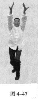 接着,以头猛然将身体领起,同时,脚下蹬地,催动双手臂向前上方螺旋拧出;左手顺时针拧翻成拇指朝下,手心朝左,右手逆时针拧翻成拇指朝下,手心朝右;随之呼气。(图4-47)