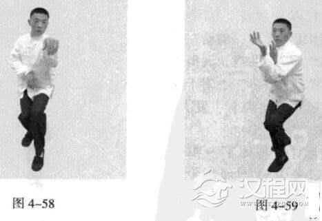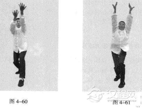 紧接着,左脚蹬地,使身体向后移动重心,右脚向后撤步,落地时五趾抓地,左脚在前,随即脚尖着地下踩;同时,双手臂向前上方螺旋拧出,左手顺时针拧翻成拇指朝下,手心朝左,右手逆时针拧翻成拇指朝下.手心朝右;随之呼气。(图4-60、图4-61)