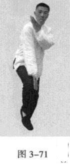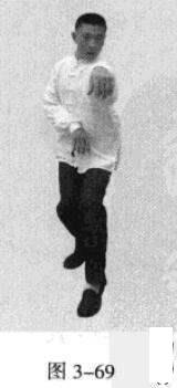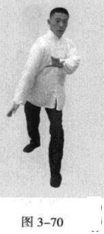 起势熊出洞。以头领身,身带步,左脚向前踩出一步。脚尖着地,右脚悬脚虚提于左脚内侧,同时吸气;用身体将左手拉回,掌心朝下,然后再由下向上如捞月状,做逆时针的圆形运动,运动至头、而部时,翻转掌心朝上,右手在下,垂于右膝部位(图3-69一图3-71)。