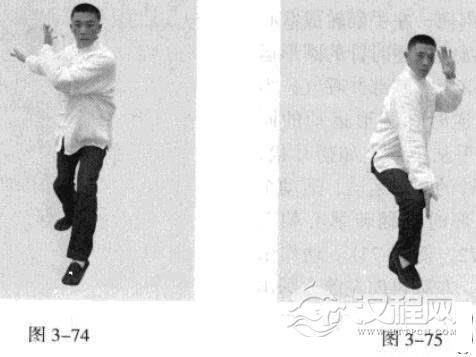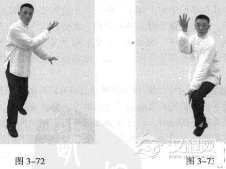 动作不停。右脚过左脚向右前方踩出一步,脚尖着地,左脚悬脚虚提于右脚内侧;左手翻转成掌心朝下,继续做逆时针的圆形运动,下落至左膝部并呼气;当左手做逆时针圆形运动的同时,右手从下向上如捞月状,做顺时针的圆形运动,运动至头、面部时,翻转掌心朝上(图3-72,图3-73)。