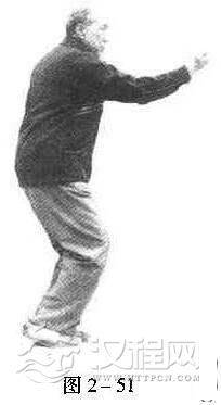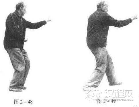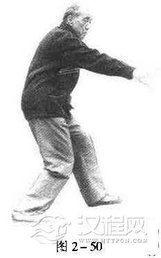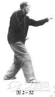 此为右式横拳。再进而打左式时,先要左脚尖微向里扣;吸气时,右拳变掌,向右、后、一卜方划弧,再经右胯旁握拳向前上钻出,拳心朝上,高与肩平;同时,右脚进至左脚内踝侧,脚尖点地成虚步,眼看右拳(图2一50、图2一51)。呼气时,横左拳,收右拳,进右脚.一切动作与要求,与打右式横拳时完全相同,惟左右相反(图2一52)。
