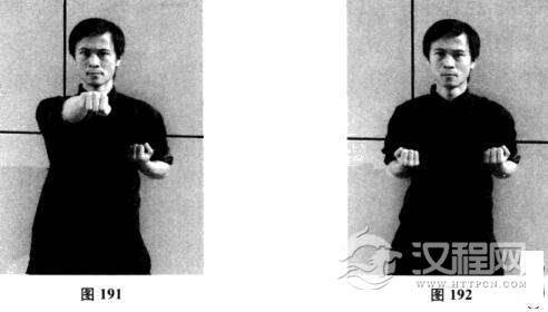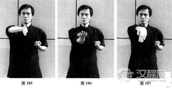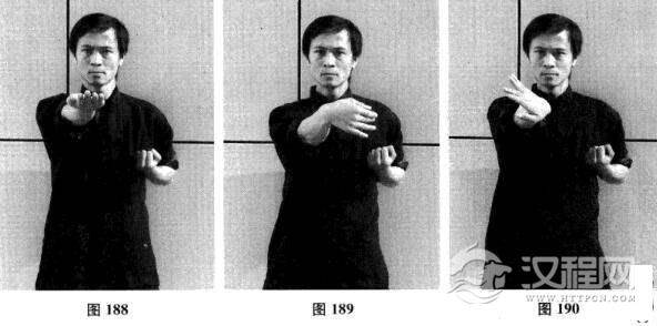 二十五、右膀手—右摊手—右昂掌—摊手、圈手、收拳(图185一图192)