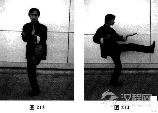 “上体松柔,下体固坚”指的是打小念头时,无论如何进行手法的变化,马步始终保持稳健的关节定位支撑,上肢与身体肌肉则始终保持放松状态。当习拳者练小念头一段时日后,可以尝试“独立脚小念头”(如图213正面和图214侧面)的练法,用一条腿的支撑来完成整个小念头拳谱的所有动作,以此来提高下盘腿力与支撑力。这样长期进行上虚下实的结构定型训练,一旦用于实战,可以保障上身不致受外力冲击而东倒西歪且能灵活卸力,而下体则坚如磐石,进退有度。