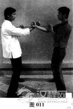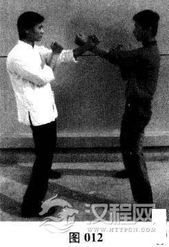 (2)马步不动,两人同时发左拳前冲对方面门,右拳回拉至左肘处,两人左臂尺骨相交(图012),
