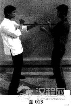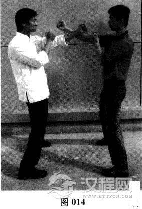 (3)上动不停,乙方收左拳,准备换右拳前冲;甲方左拳不收,置于双方中线位置(图013);待乙方右拳冲来时,甲方左拳自下而上穿出,此时,甲方左臂挠骨与乙方右臂尺骨相交(图014).