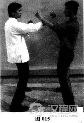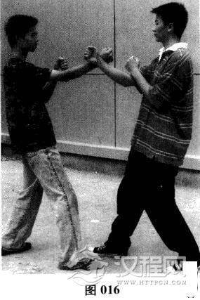 (1)训练时,两人以进退马冲拳姿势相对而立,同时以日字冲拳手型冲右拳,击对方面门,左拳回拉右肘处.两人右臂尺骨相交(图016),