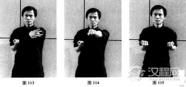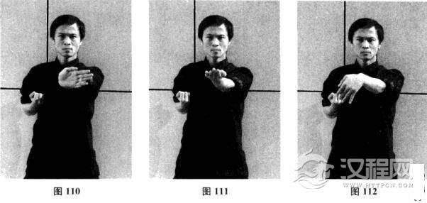 十八、左侧掌—左横掌—摊手、圈手、收拳(图107-图115)