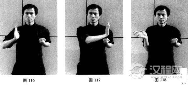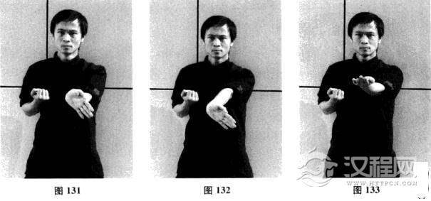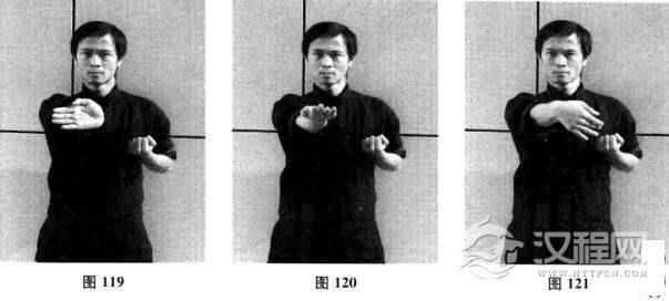 十九、右侧掌—右横掌—摊手、圈手、收拳(图116-图124)