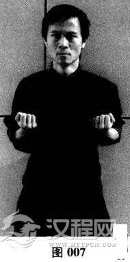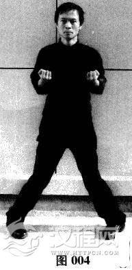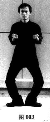 双膝微曲,双手握拳尽童上提至两胸侧,双肘向身后拉双拳,至拉不动时双拳贴身定住;双脚以脚跟为轴向两侧外开.旋转成“一”字形,然后双脚以双脚掌为轴向两侧外开,旋转成“八”字形;双膝内嵌上提.含胸拔背,沉肩竖颈,下领微收,臀部勿外凸,身体重心落于两脚脚中心连线上。从身体侧面看,整个身形略似一个倒放的“S”状。