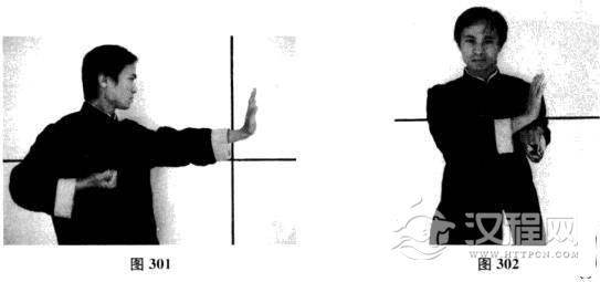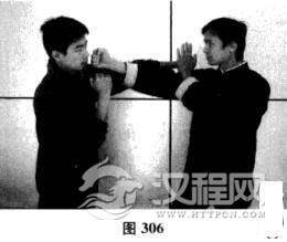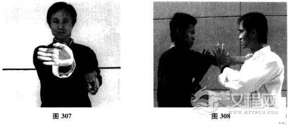 三、横掌的两种用法(注:横掌多用于攻击对手咽喉及肋骨部位,如图307)