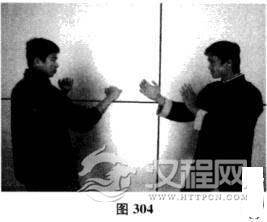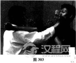 当对手出右直拳攻我方头而时,我方左侧掌自外门向内拍开对方攻来之手竹.同时右手正掌自对手右臂下穿出,直击对手下巴,此为连消带打之法(如图303)。