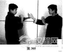 我方以正身前进马配合右手问手对敌,对手突然近身出后手左直拳.越过我方前锋手直攻头面;我方左侧掌立时将对手左拳拍离中线,同时右手变拳直冲对手面门(如图304一图306),此为迎击之法。