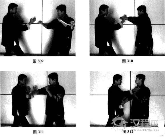 (2)我方以正身前进.马配合右手问手对敌,对手突然近身出后手左直拳攻我方头面,我方右手问手变侧掌将其攻击拍离中线;对手迅速出右直拳攻我方下巴,我方右手尺骨侧向发力将其右拳牵引出中线,同时右手变横掌,掌根直击对手咽喉部位(如图309-图312)。