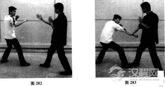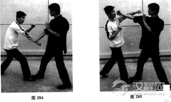 我方以正身前进马配合右手问手对敌,对手突然近身出右拳,以潜身下击拳攻我方腹部;我方右手问手迅速变抹手,由中线自上而下直落,将对手拳劲化开;对手见机甚快.迅速起身以左手上击拳攻我方头面.我方右手自下而上迅速弹起.在弹开对手左手拳的同时,右拳击中其面门(如图282一图285).
