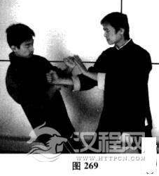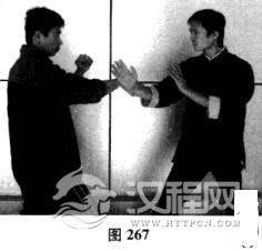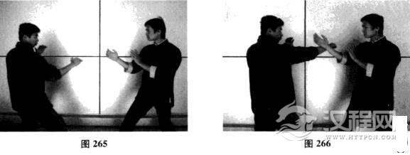 我方以正身前进马配合右手问手对敌.对手突然近身出右拳攻我方头面.我方前手问手封住对手右竹;对手突然变拳为拿,擒住我方右腕向后拽拉;借对方后拉之势,我方迅速上步进马,右手腕及尺骨紧贴对手右臂,向其身体中线心窝直冲,川身体前冲之力化解对手擒拿,同时枕手变拳击中,对手心窝部位(如图265-图269)