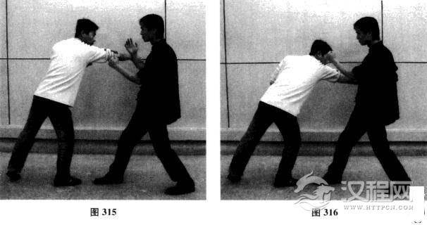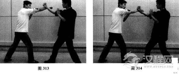 我方以正身前进马配合右手问手对敌,对手突然前冲以右直拳攻我面门,我方也出右拳封住.双方尺骨相交;对手反应十分快,右手变拳为抓,欲捆抓我方右臂;我方突然沉肘发力回带右臂,对手不仅手臂被留住,同时身体重心也被带动前冲,直撞向我方左拳(如图313一图316)。