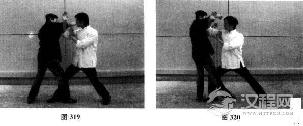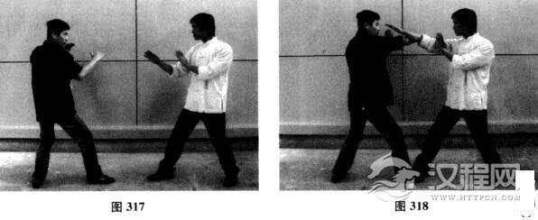 我方以正身前进马配合右手问手对敌,对手突然前冲以右直拳攻我方面门,我方右手标出封住对方攻势,双方尺骨相交;对手相持不下欲后退,我方趁势进马上步,右臂贴对手大臂汾人其腋下.同时沉肘发力将其送出(如图317一图320)。