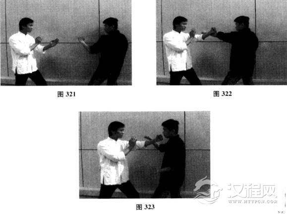 我方以正身前进马配合左手问手对敌,对手突然前冲以左直拳攻我方面门,我方左手亦冲拳封住对方攻势,双方尺骨相交;对手左臂撤回欲出右拳攻我方,我方左拳趁间隙滑落对方中线,击中其面门(如图321一图323)。