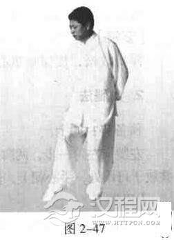 一腿站立,一腿虚提,以虚提之脚尖为轴.脚踝放松.先顺时针划平圆活动脚踩;然后再逆时针划平圆活动。反复活动(图2-47)。