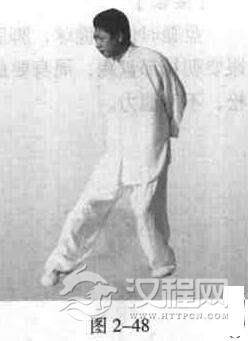 一腿微屈站立,另一腿亦弯曲,前脚掌前伸踩.以前脚掌为轴.脚跟向外碾踩.再向内碾踩。双脚轮换反复活动(图2-48)。