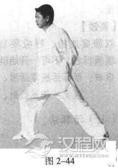 右脚向前跨出一步.成半弓步;倒背双手,右膝以右足跟为圆心,顺时针划平圆活膝,重复练习.然后再反向逆时针划圆活膝(图2-44)。