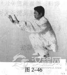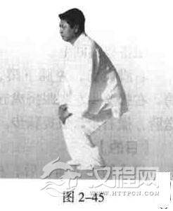 蹲身并步,两手按在两膝盖上,双膝向左、向前、向右、向后划平圆活动。反向亦然(图2-45).