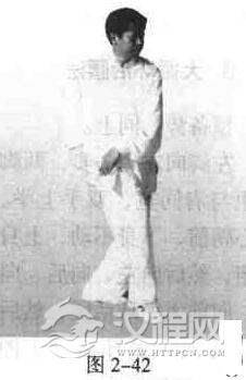 左腿下蹲,右脚向前成提膝步.左胯不动,右胯上提,然后重心向前放松落胯成五五步,反复练习。换左提膝步,提左胯亦如此(图2-42).